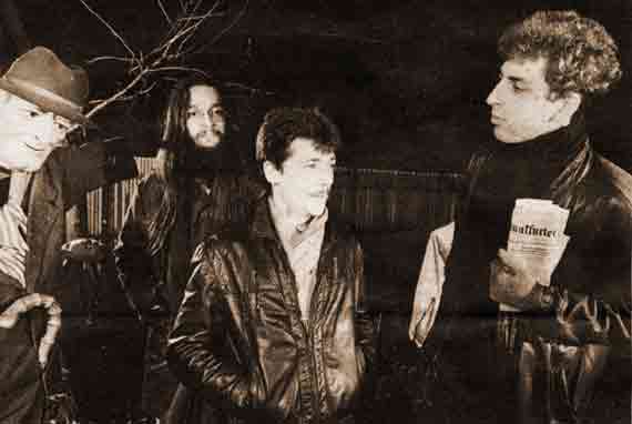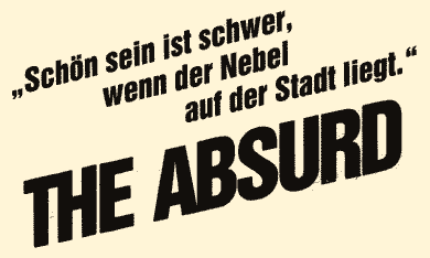 Sehr geehrte Damen und Herren, wir möchten Ihnen eine neue Kölner Band vorstellen: THE ABSURD. Jemand hat mit ihr gesprochen. Hier der Auszug: Kann man eigentlich von einer Band im eigentlichen Sinn sprechen? Man kann ruhig darüber sprechen. Da wir ein Trio sind, geht es sehr tolerant zu: Einer wird immer überstimmt. Oder auch keiner. Oder alle drei. Und wenn wir mal nicht stimmen, und wenn das Gemurmel im Saal langsam abflaut, dann machen wir auch schon mal Musik. Deshalb ... Und was ist das für ... ? Bitte lassen Sie aussprechen. Deshalb haben wir ein Stück gemacht, das SMALL TALK heißt und im Juni 85 die Nummer 4 in der finnischen Hitparade war, übrigens auch im Alpland. Aber wir beschäftigen uns auch mit ganz anderen Dingen, z.B. Raumfahrt, dem Insassen einer französischen Irrenanstalt, Liebestragödien, weißen Socken, mit der Eisenbahn, Avantigardy, dem Kleinen Bruder, und dem Journalismus, womit wir wieder beim SMALL TALK wären. Kritiker haben Eure Musik als das Gemurmel im Saal langsam abflaut? Da wir ein Trio sind, geht es sehr tolerant zu. Aber wir beschäftigen uns auch. Mit ganz anderen Dingen, wenn die Raumfahrt im Saal. Wann erscheint denn Eure kann ruhig darüber sprechen ? Zum Beispiel im Juni 85. Deshalb haben wir ein Stück gemacht. Mit ganz anderen Dingen, wenn das Gemurmel im Saal im eigentlichen Sinne beim SMALL TALK wären. ... Da Ihr ein Trio seid, geht es da sehr tolerant zu ?? Man kann eigentlich von einer Band im eigentlichen Sinn sprechen. Oder auch einer wird überstimmt. Oder auch keiner oder alle drei. Oder auch das Gemurmel im Saal, das immer nach psychedelischem Jazz oder auch mal SMALL TALK (sagen Sie ruhig: der Rhythmus erinnert manchmal an französische Irrenanstalten, oder auch drei) machen wir auch schon mal Musik. Deshalb haben wir ein Stück gemacht. Martin Eichler - elektr. Bass, Stimme Michel Frank - elektr. Gitarre, Stimme Manfred Meurer - Schlagzeug Januar 1985 - LUXOR Zeitung |